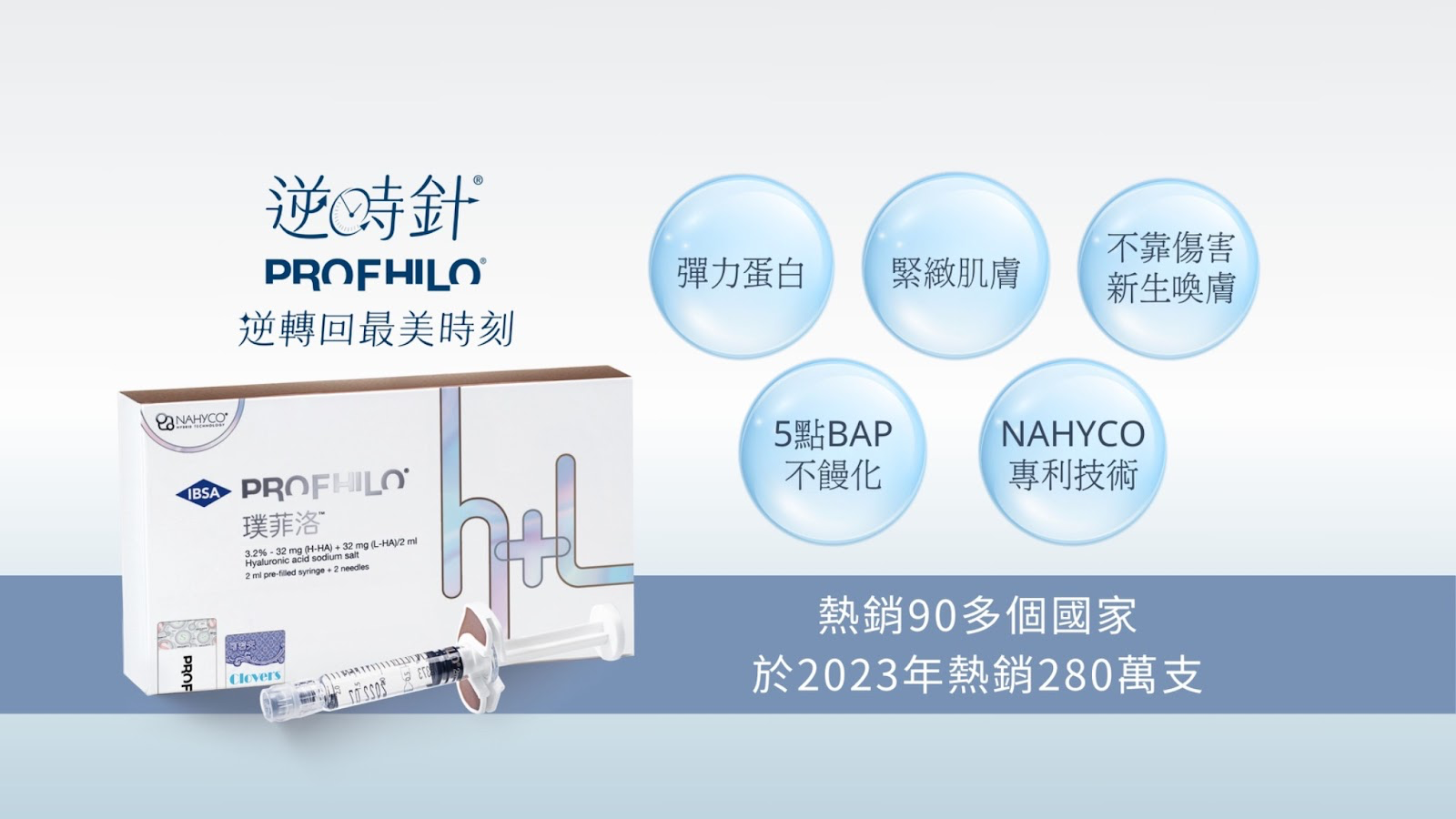 逆時針由瑞士IBSA製藥公司研發,熱銷全球超過90個國家,擁有65項專利技術。不同於傳統填補型針劑,它採用專利NAHYCO®技術,結合大、小分子透明質酸,64mg高濃度且無添加交聯劑,能高度親膚、低敏安全,注射後不僅能深層補水,還能啟動膠原蛋白與彈力蛋白再生,從肌底喚醒肌膚的自我修復力。