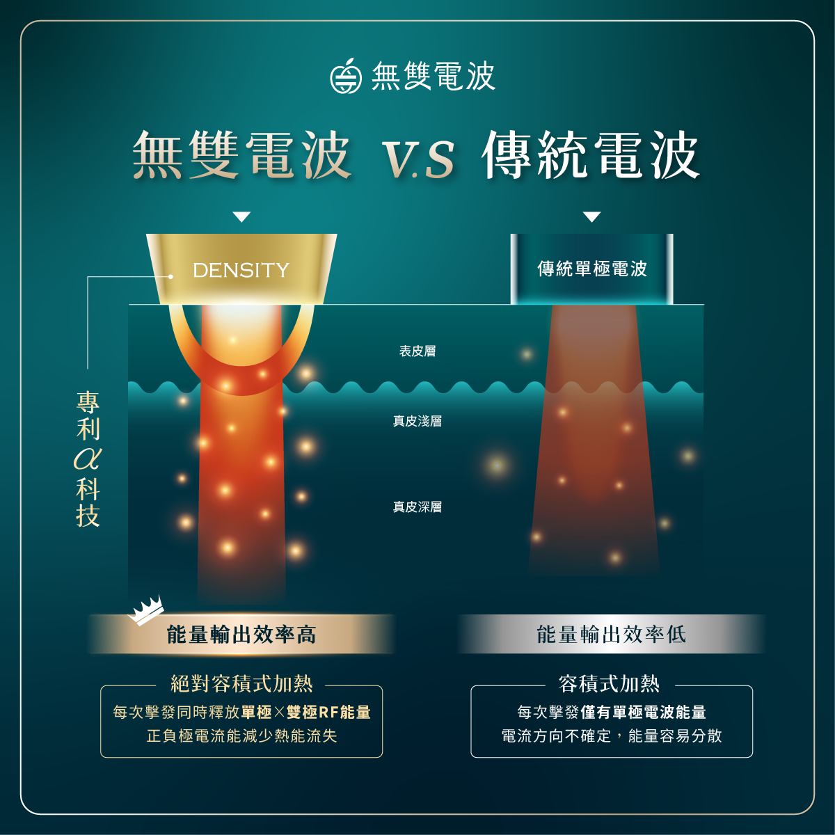 Density 無雙電波採用專利α科技,單次擊發同時提供單極與雙極能量,針對真皮淺層(乳突層、網狀層)及深層加熱,促進膠原蛋白重組新生,使肌膚恢復緊緻與彈性。