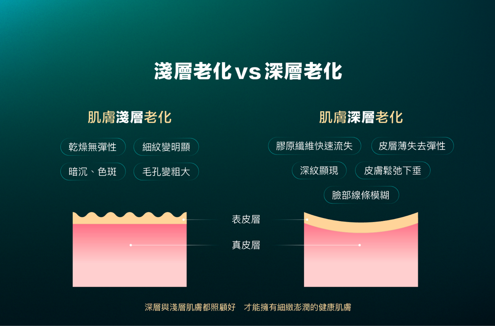 肌膚老化分為淺層老化及深層老化,淺層與深層都照顧好,才能擁有細緻澎潤的健康肌膚。